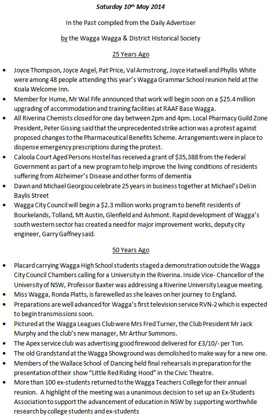 In the Past is compiled from the Daily Advertiser by the Wagga Wagga & District Historical Society