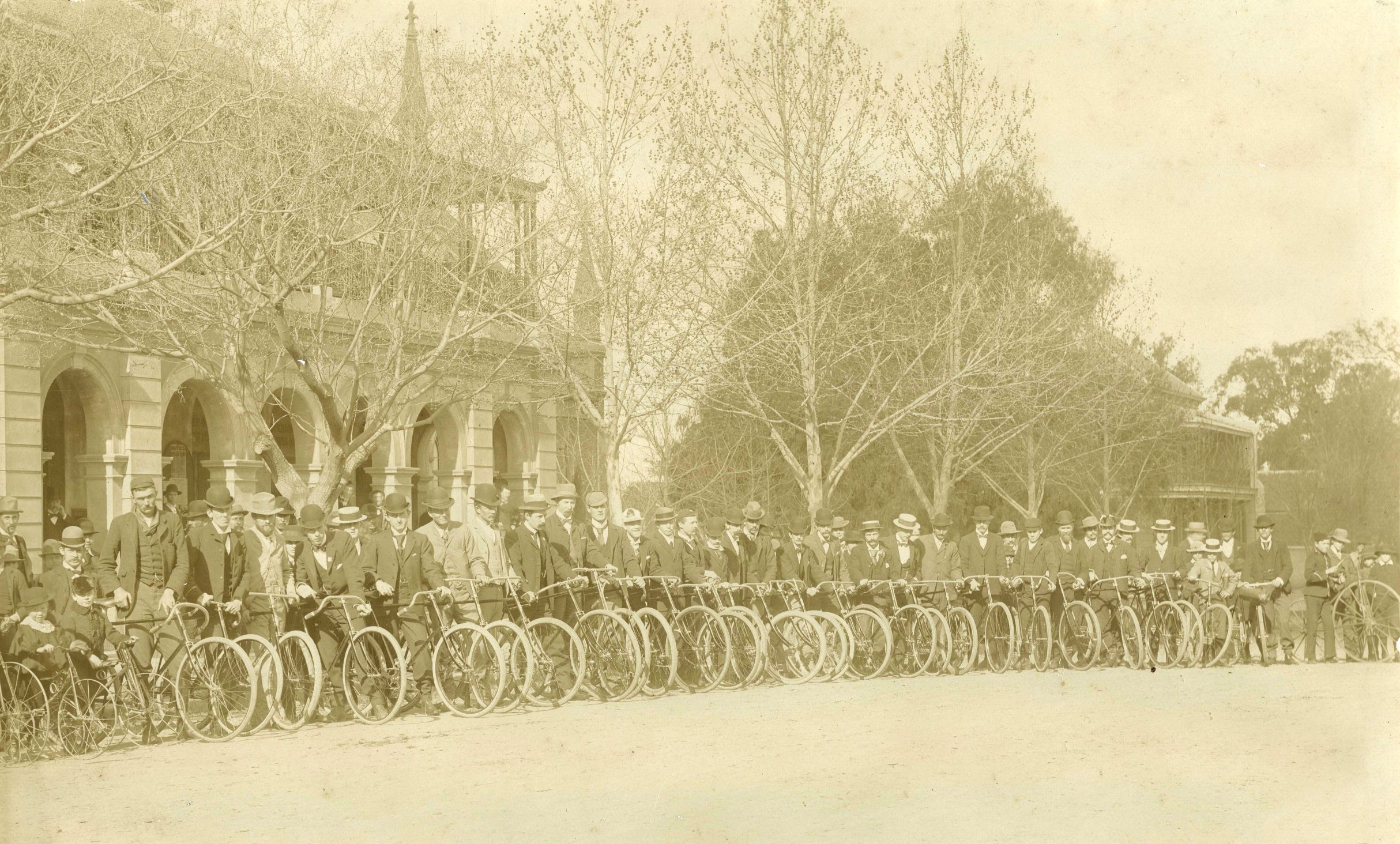 Wagga Cyclists - A Race Day c.1895 [RW5.388]Cycle racing was very popular in the late 1800s. This photo, taken in 1895 outside the Post Office shows cyclists ready to participate in one of the regular race days. Picture: CSURA RW5