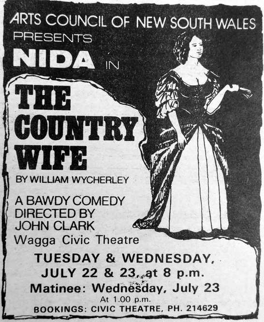 - The Arts Council of New South Wales will present at the Wagga Civic Theatre, “The Country Wife’, a bawdy comedy directed by John Clark.