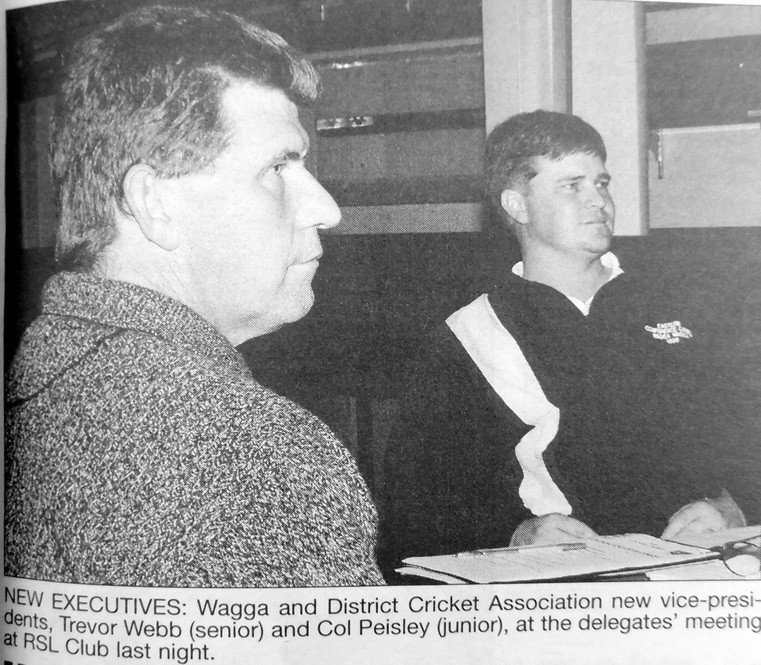 - Wagga and District Cricket Association again failed to fill the key positions of president and secretary at a special meeting, however two vice-presidents, Trevor Webb (senior) and Col Peisley (Junior) came to the rescue as vice-presidents.