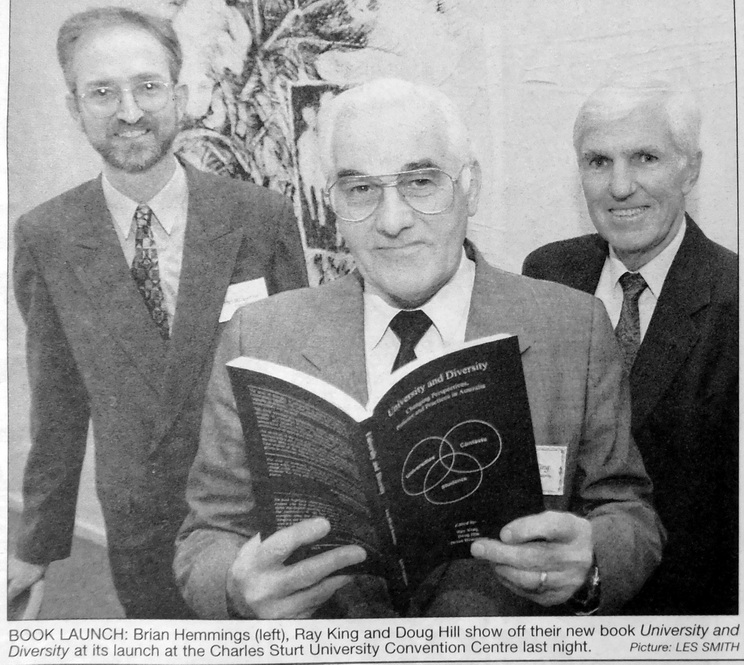 - Brian Hemmings, Ray King and Doug Hill are pictured with their new book “University and Diversity” launched at the Charles Sturt University Convention Centre.