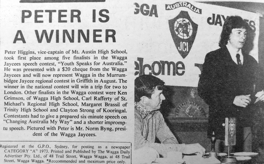 - Peter Higgins, vice-captain of Mount Austin High School took first place among five finalists which also included Ken Grimson, Carl Rafferty, Margaret Brassil and Clayton Strong in the Wagga Jaycees speech contest, “Youth Speaks for Australia”.