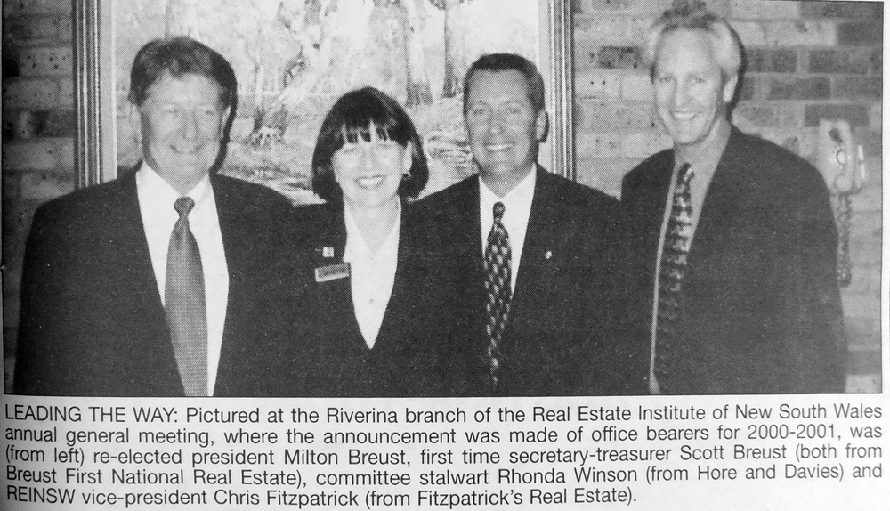 - The Riverina branch of the Real Estate of New South Wales has re-elected Milton Breust as its president. He is pictured with Scott Breust, Rhonda Winson, and Chris Fitzpatrick who also filled positions.