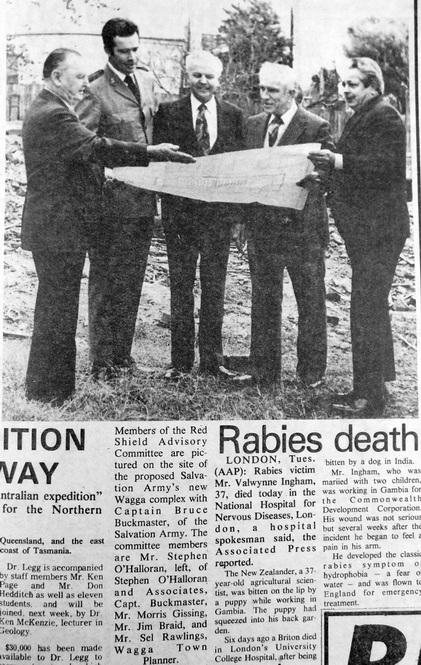 - Members of the Red Shield Advisory committee, Salvation Army, Captain Buckmaster, Mr Morris Gissing, Mr Jim Braid and Town Planner, Mr Sel Rawlings are pictured with architect, Stephen Halloran on the site of the Salvation Army’s new complex in Edward Street.