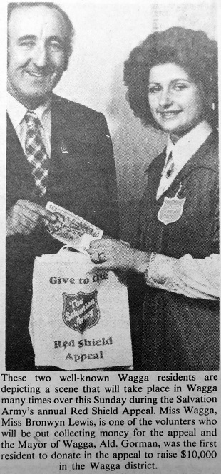 - Miss Wagga, Bronwyn Lewis, is one of the Red Cross volunteers collecting money for this years Red Shield Appeal and is pictured with Wagga Mayor, Ald Gorman who was the first Wagga resident to donate to the appeal.