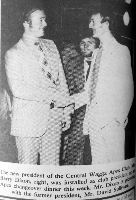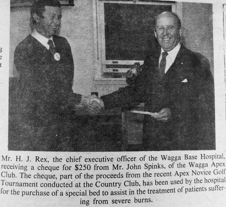 - Chief executive officer of Wagga Base Hospital, Mr H J Rex received a cheque for $250 from John Spinks of Wagga Apex Club which was part of the proceeds of the recent Apex Novice Golf Tournament.