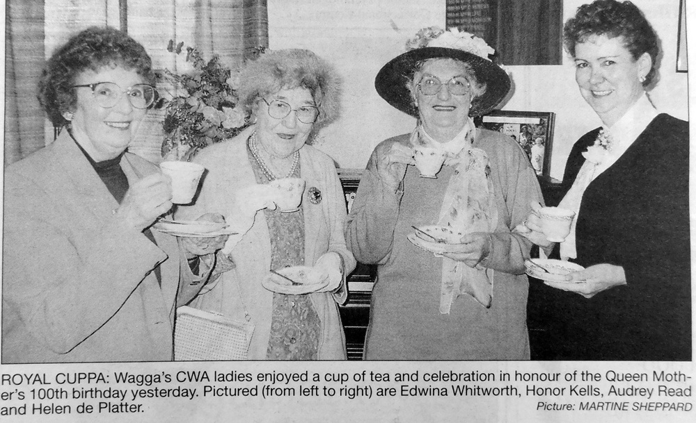 - Edwina Whitworth, Honor Kells, Audrey Read and Helen de Platter were among CWA ladies pictured enjoying a cup of tea in honour of the Queen Mother’s 100th birthday.