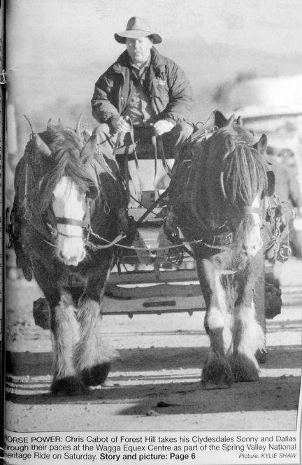 - Chris Cabot from Forest Hill is pictured taking his Clydesdales Sonny and Dallas, through their paces at the Wagga Equex Centre as part of the Spring Valley National Heritage Ride.