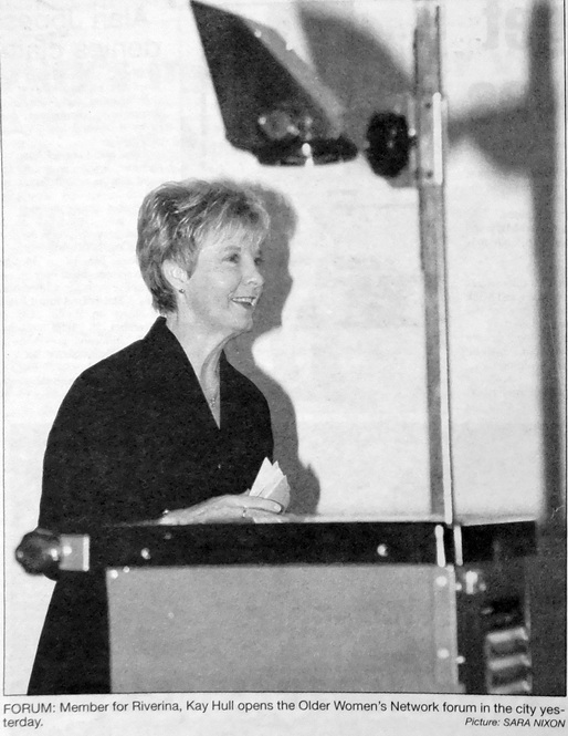 - Member for Riverina, Kay Hull opened an Older Women’s Network Forum organised by the local branch of the Older Women’s Network in conjunction with the Women’s Health Centre.