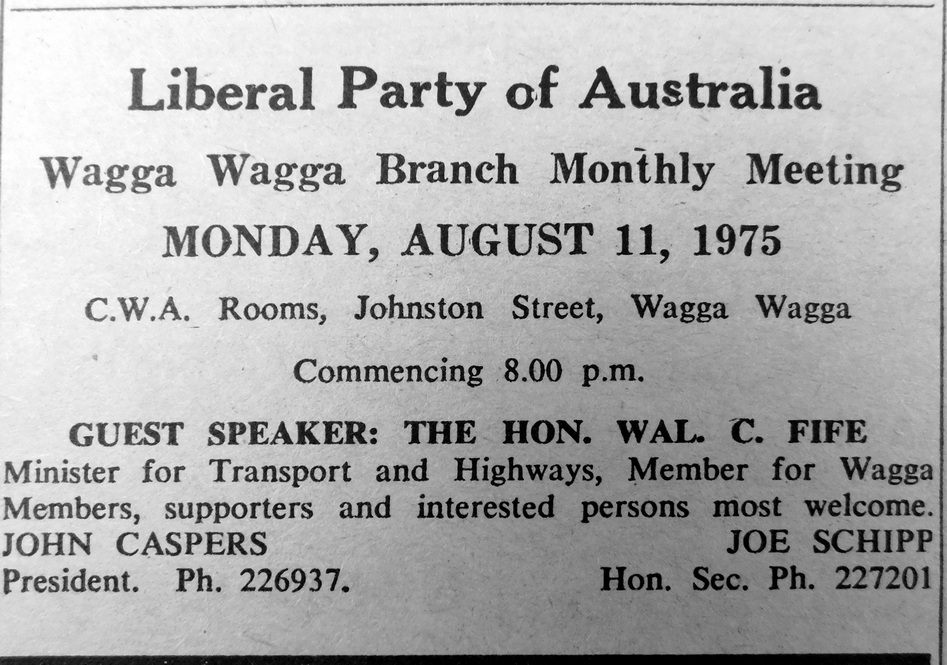 - President, John Caspers and Secretary Joe Schipp advise that local member, Wal Fife will be the guest speaker at the next monthly meeting of the Liberal Party Wagga Wagga branch.