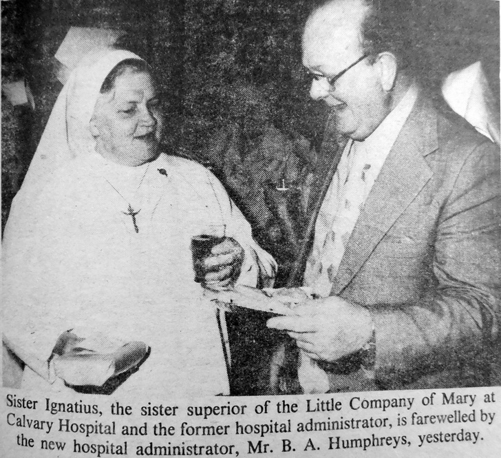 - Sister Ignatius the sister superior and former administrator of Calvary Hospital has been farewelled before leaving Wagga next week to take up a new post in Tasmania.