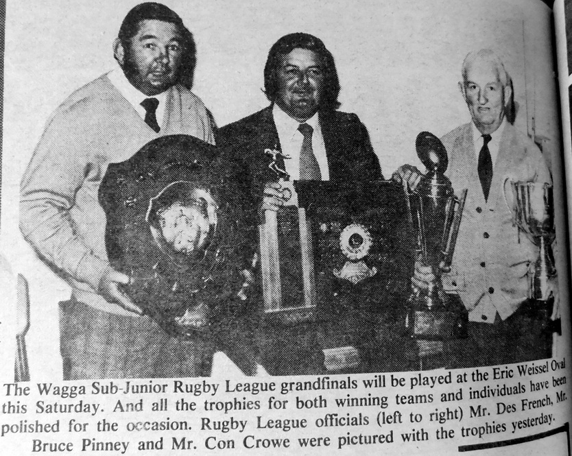 - Des French, Bruce Pinney and Con Crow are pictured with trophies to be presented at the Wagga Sub-Junior Rugby League grand finals to be held this weekend at the Eric Weissel Oval.