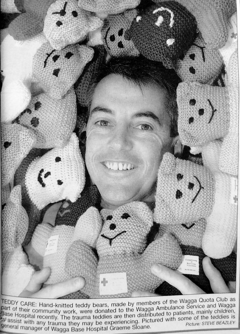 - General manager of Wagga Base Hospital, Graeme Sloane is pictured with hand-knitted trauma teddy bears made by members of Wagga Quota Club and donated to the Wagga Ambulance Service and Wagga Base Hospital.