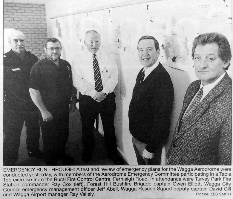 - Members of the Aerodrome Emergency Committee including Ray Cox, Owen Elliott, Jeff Abell, David Gill and Ray Vallely took part in a test and review of emergency plans for the Wagga airport.