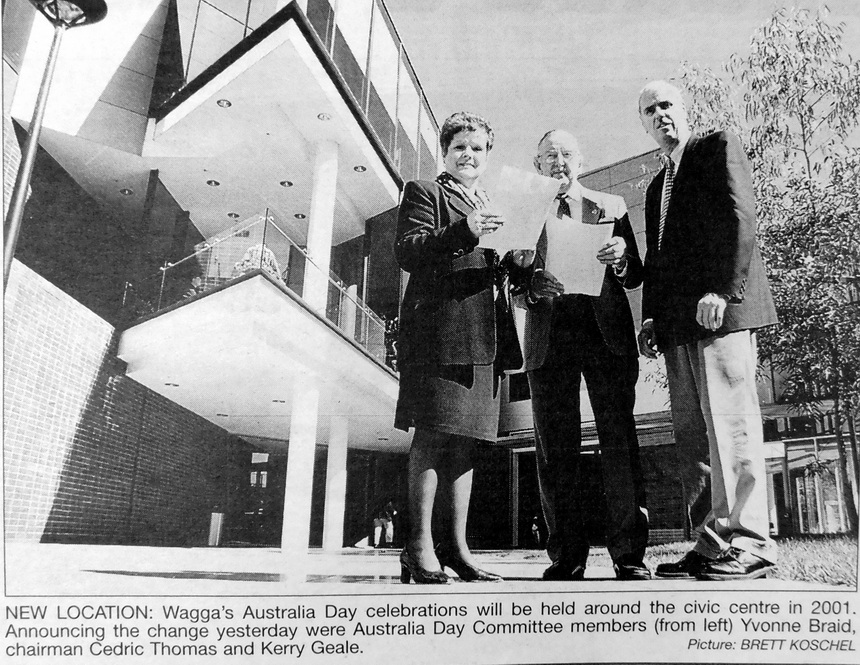- Australia Day Committee members, Yvonne Braid, Cedric Thomas and Kerry Geale are pictured announcing that Australia Day celebrations in 2001 will be held around the Civic Centre.