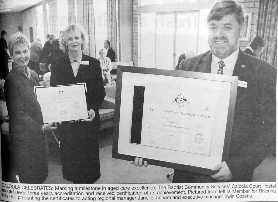 - Member for Riverina, Kay Hull and acting BCS Regional Manager, Janelle Tinham are pictured with Caloola Court Hostel manager Irwin Couzens who is holding a three-year certificate of accreditation awarded to Caloola.