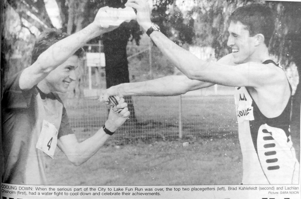 - The top two placegetters in the City to Lake Fun Run, Lachlan Chisholm and Brad Kahlfeldt are pictured having a water fight after the race to cool down.