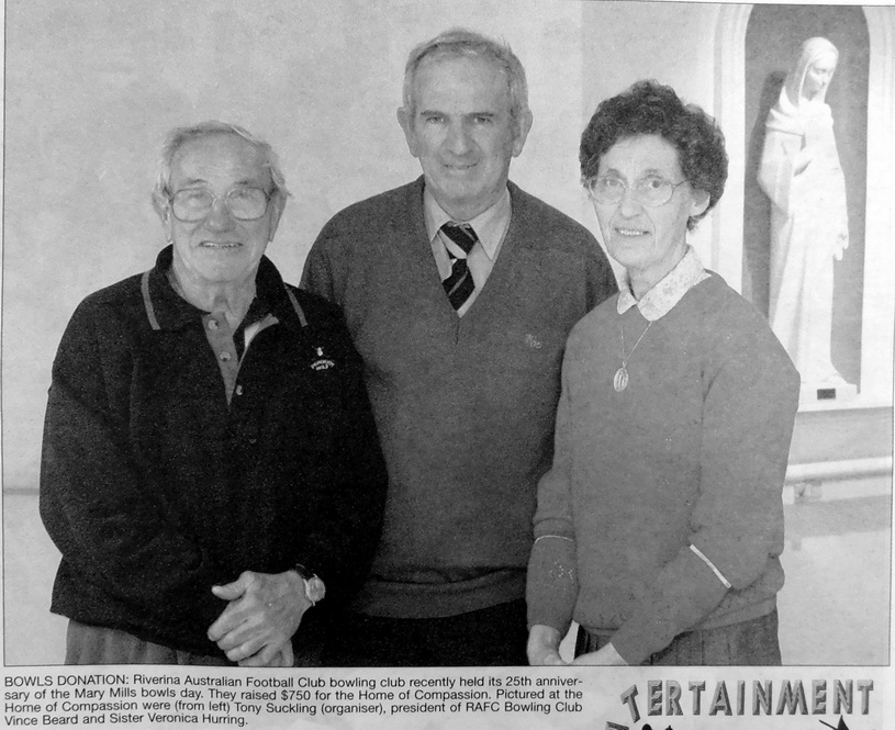 - Tony Suckling and Vince Beard are pictured presenting $750, the proceeds of a bowls day held for the 25th Anniversary of the Mary Mills bowls day, to Sister Veronica Hurling from the Home of Compassion.