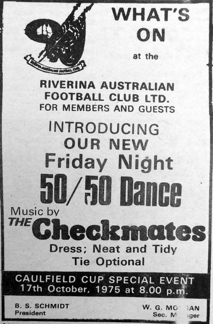 - Riverina Australian Rules Football Club is introducing a new Friday 50/50 dance night with music by the Checkmates. Dress code is neat and tidy with tie optional.