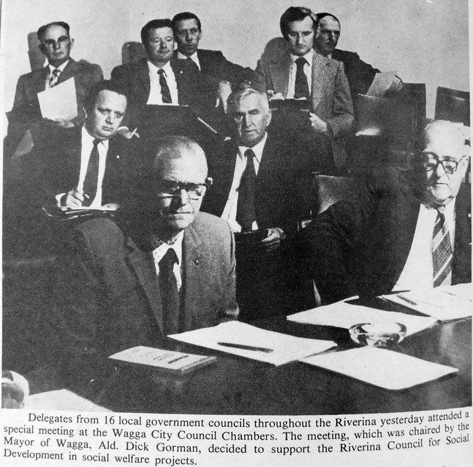- Delegates from 16 local government councils throughout the Riverina attended a special meeting chaired by Wagga’s Mayor, Ald Dick Gorman which decided to support the Riverina Council for Social Development in social welfare projects.
