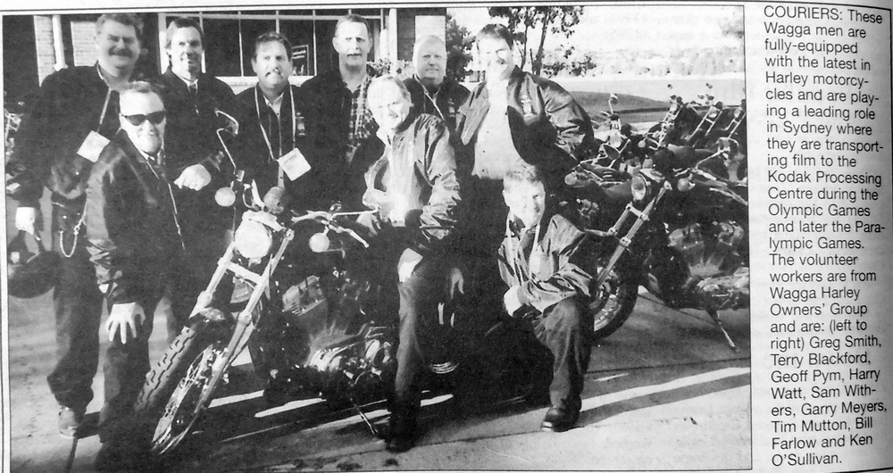 - Volunteers from the Wagga Harley Owners Group including Greg Smith, Terry Blackford, Geoff Pym, Harry Watt, Same Withers, Garry Myers, Tim Mutton, Bill Farlow and Ken O’Sullivan are playing a leading role at the Sydney Olympics where they are transporting film to the Kodak Processing Centre.