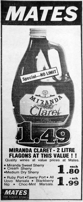 - Mates are selling Miranda Claret in two litre flagons for $1.49.