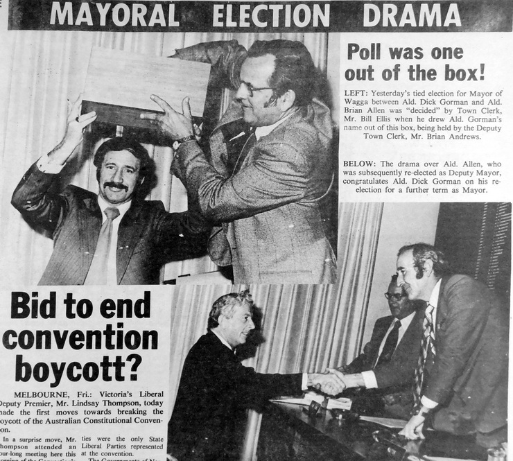 - Ald Dick Gorman was re-elected to a third term as Mayor in a controversial tied ballot with Ald Brian Allen.