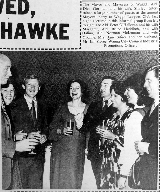 - Ald Peter O’Halloran and his wife, Margaret, Ald Bruce Hedditch and his wife, Halina, Ald Norm McLennan and his wife Yvonne, Mrs Jane Sibree and her husband, Mr Jim Sibree, Wagga City Council Industrial Promotion s Officer were among many guests attending the annual Mayoral party at the Wagga Leagues Club.