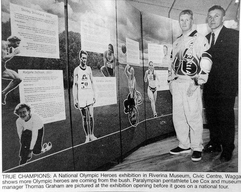 - Paralympian pentathlete Lee Cox is pictured with museum manager, Thomas Graham at a National Olympic Heros exhibition at the Museum of the Riverina.