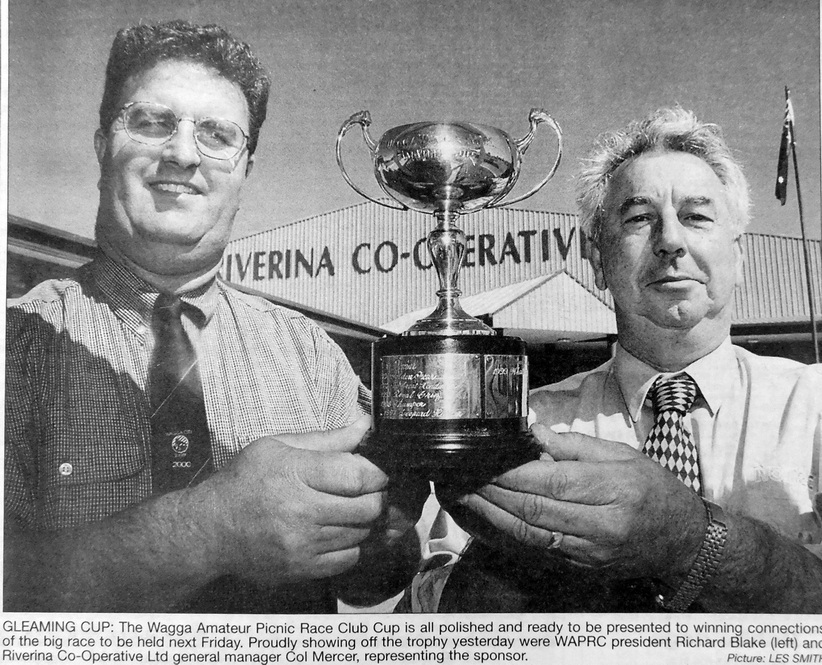 - Richard Blake, president of the Wagga Amateur Picnic Race Club is pictured with sponsor Col Mercer from the Riverina Co-operative holding the cup which will be presented to winning connections at the big race to be held next week.