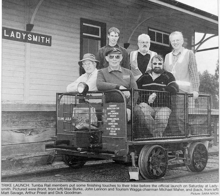 - Tumba Rail members including Max Burke, John Lennon, Matt Savage, Arthur Priest, Dick Goodman, and Tourism Wagga chairman, Michael Maher are pictured putting finishing touches to their trike before their official launch at Ladysmith on Saturday.