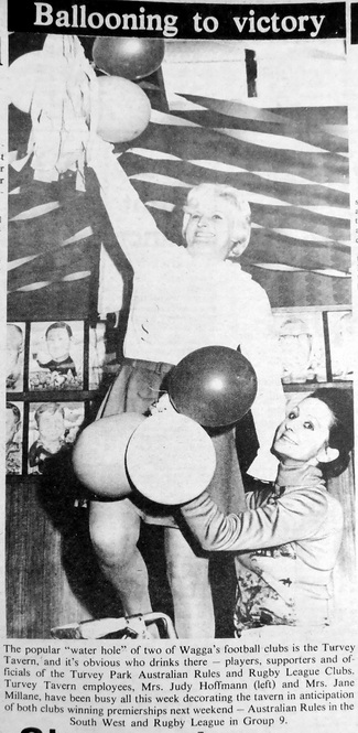 - Turvey Tavern employees Mrs Judy Hoffman and Mrs Jane Millane have been busy decorating the tavern in anticipation of both Turvey Park Australian Rules and Turvey Park Rugby League teams winning premierships next weekend.