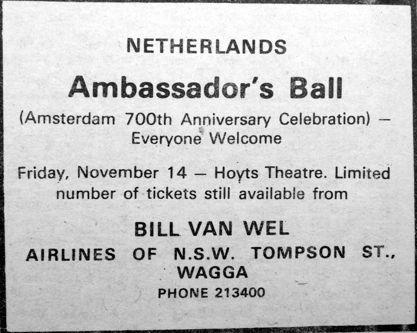 - The Netherland Ambassador Mr R C Pekelharing unveiled a sign at Amsterdam Crescent before attending celebrations organised by Wagga’s Dutch community to celebrate the 700th anniversary of the City of Amsterdam.