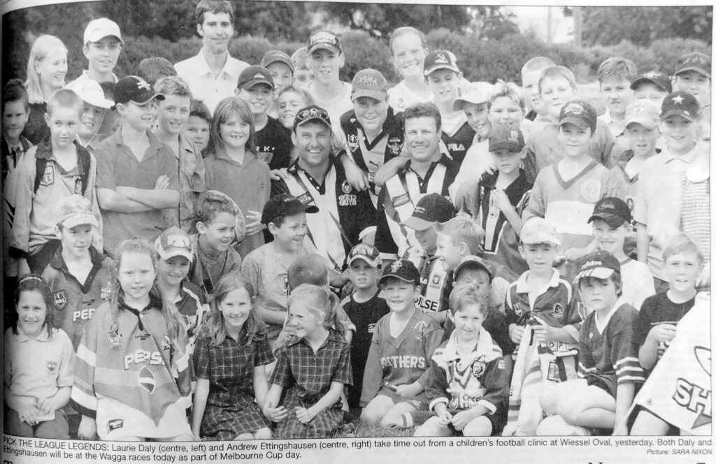 - League legends, Laurie Daley and Andrew Ettingshausen are visiting Wagga and held a children’s football clinic at Weissel Oval.