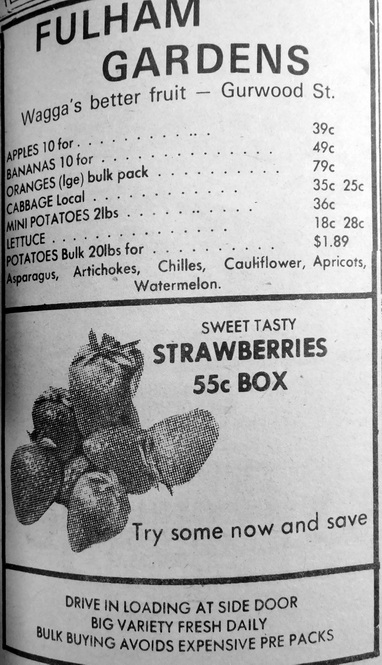 - Fulham Gardens in Gurwood Street is selling strawberries for 55c a box, apples, 10 for 39 cents and bananas, ten for 49 cents.