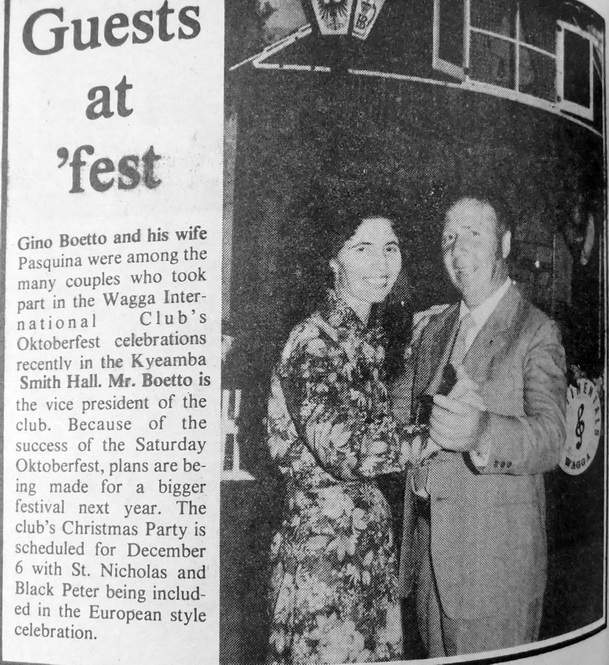 - Gino Boetto and his wife Pasquina are pictured attending the recent Wagga International Club Oktoberfest celebrations in the Kyeamba Smith Hall.