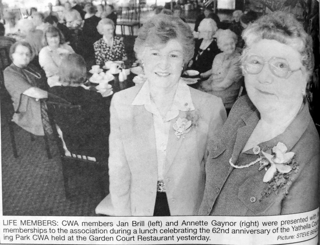 - Jan Brill and Annette Gaynor were presented with life memberships during a luncheon celebrating the 62nd anniversary of the Yathella Coursing Park CWA held at the Garden Court Restaurant.