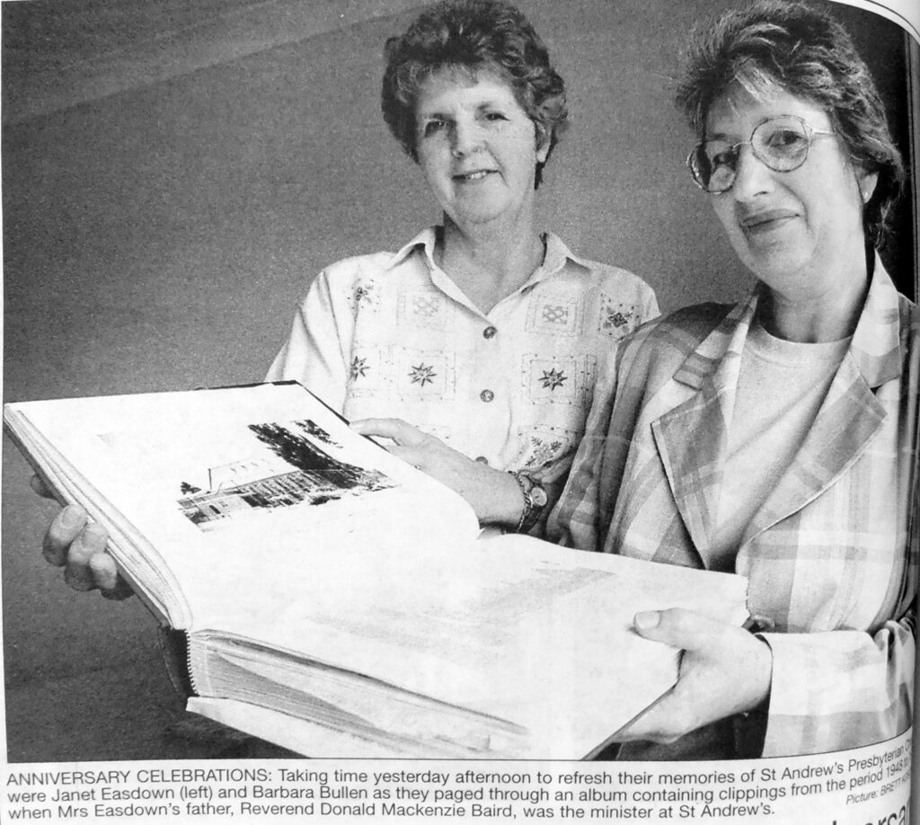 - Janet Easdown and Barbara Bullock are pictured viewing a book of clippings in preparation for the celebration of St Andrews church 130th anniversary later this month.