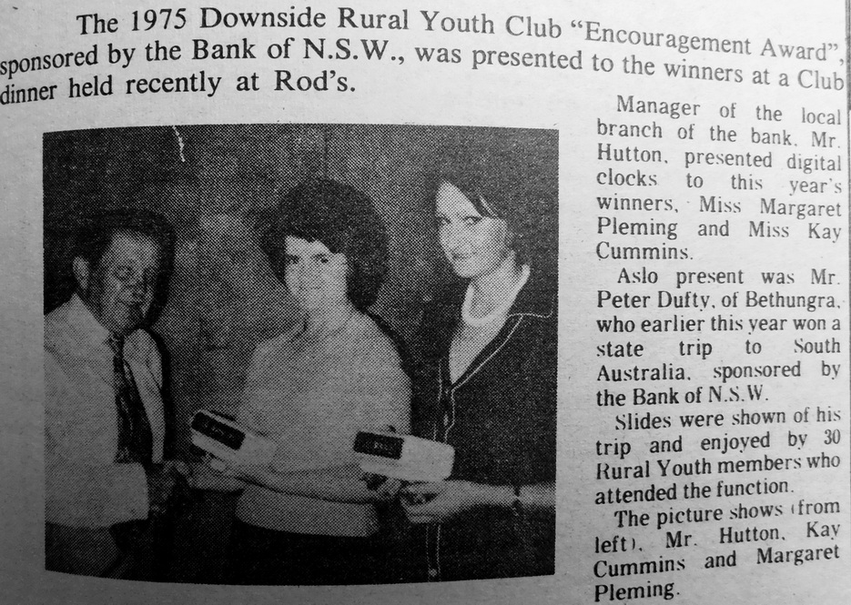 - Miss Margaret Pleming and Miss Kay Cummins were presented with “Encouragement Awards” by the Downside Rural Youth Club at a special function held recently at Rod’s restaurant.