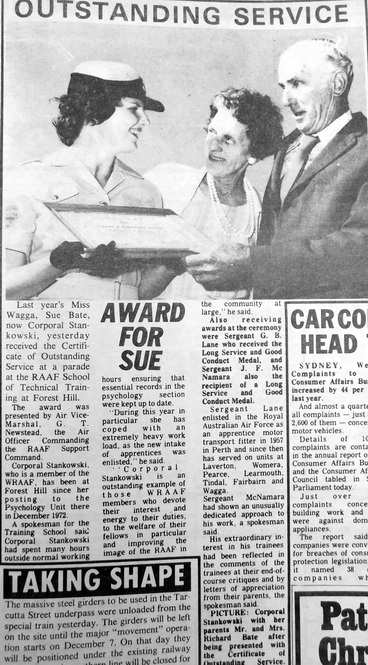 - Last year’s Miss Wagga, Sue Bate, now Corporal Stankowski received the Certificate of Outstanding Service at a parade at the RAAF School of Technical Training at Forest Hill.