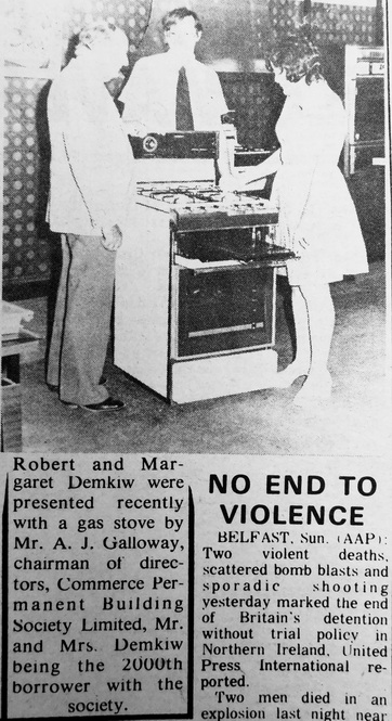 - Robert and Margaret Demkiw were the 2000th borrowers with The Commerce Permanent Building Society and were presented with a gas stove by Mr A J Galloway chairman of the society.
