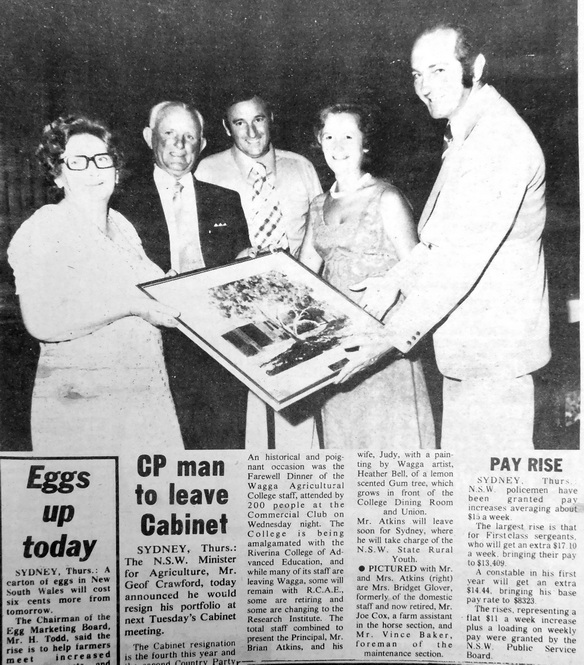 - The Wagga Agricultural College is amalgamating with the Riverina College of Advanced Education with Agricultural College Staff making a presentation to Principal Brian Aikins and his wife Judy at a Farewell Dinner for college staff attended by 200 people at the Wagga Commercial Club.