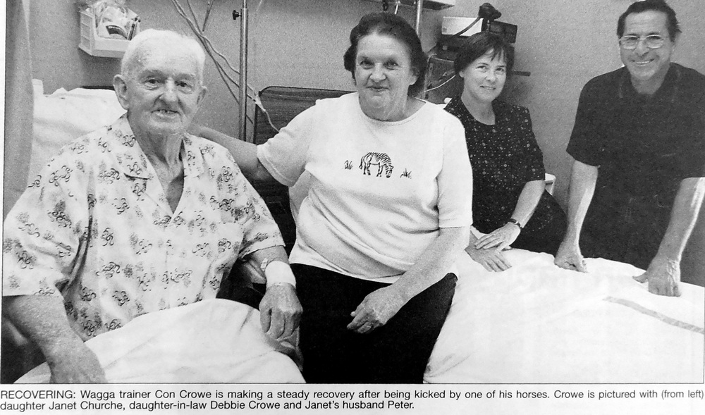 - The world’s oldest racehorse trainer, Wagga’s Con Crowe, is pictured in hospital making steady progress after being kicked by one of his horses.
