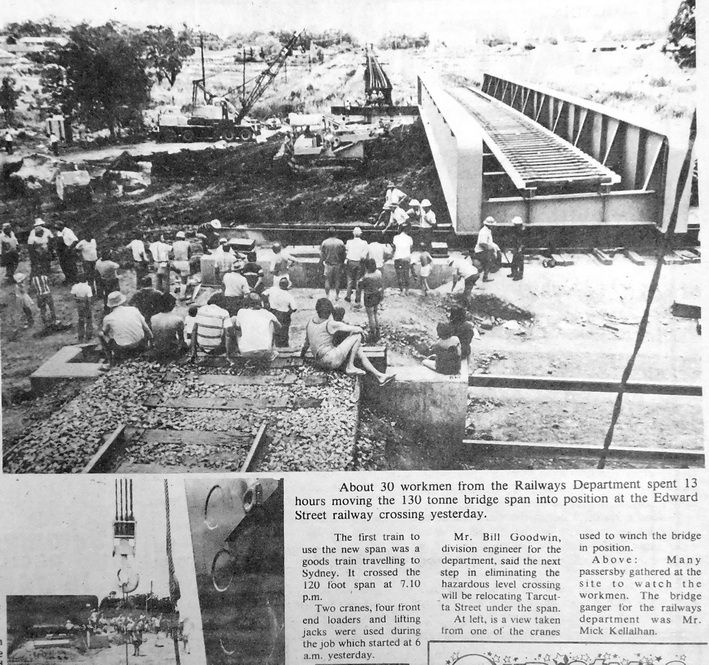 - About 30 workmen from the Railways Department spent 13 hours moving the 130-tonne bridge span into position at the Edward Street railway crossing.