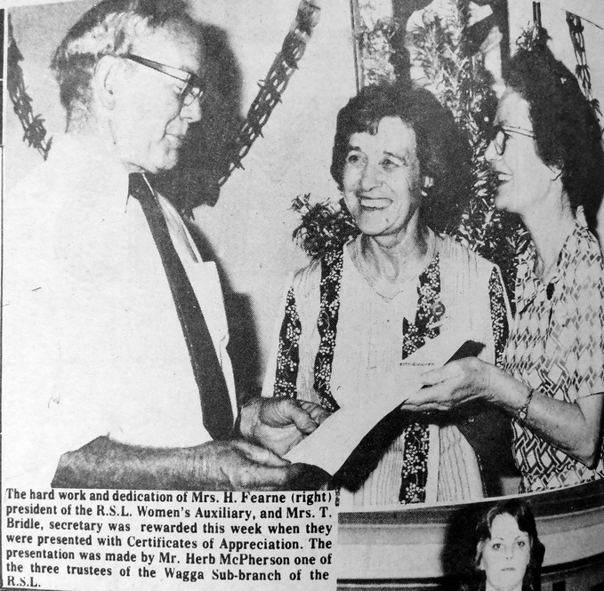 - Mr Herb McPherson, one of the three trustees of the Wagga R.S.L. Sub-Branch, presented certificates of Appreciation to Mrs H Fearne, president of the R.S.L. Women’s Auxiliary and Mrs T Bridle, secretary.