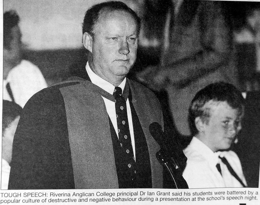 - During his speech night presentation, Riverina Anglican College principal, Dr Ian Grant, said his students were battered by a popular culture of destructive and negative behaviour.