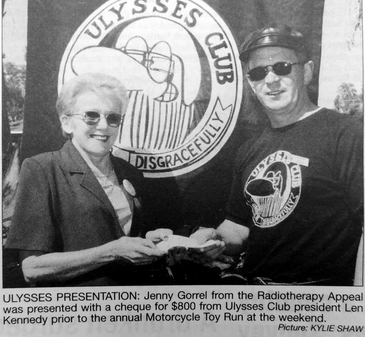 - Jenny Gorrel from the Radiotherapy Appeal was presented with a cheque for $800 from Ulysses Club president Len Kennedy prior to the annual motorcycle Toy Run.