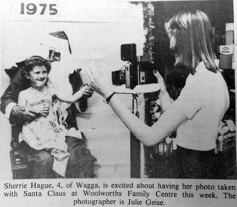 - Sherrie Hague of Wagga is pictured having her photo taken with Santa Claus by photographer, Julie Geise at Woolworths Family Centre.