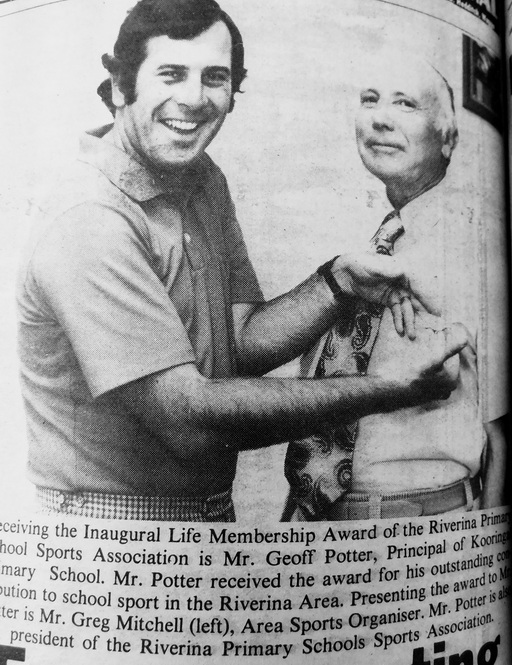- Principal of Kooringal Primary School, Geoff Potter was presented with the Inaugural Life Membership award of the Riverina Primary School Sports Association by Riverina Area Sports Organiser, Greg Mitchell.