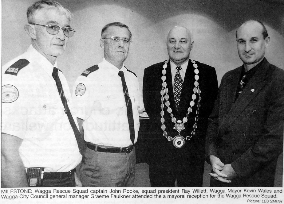 - Wagga Rescue Squad captain John Rooke, squad president Ray Willett, Mayor Kevin Wales and Wagga City Council general manager, Graeme Faulkiner are pictured attending a mayoral reception celebrating 50 years of service to the community by the Wagga Rescue Squad.